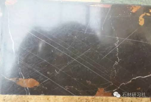 别小瞧这些颗粒,因为我们的晶面机转速一般为175转,或200转。抛光时,钢丝棉或者百洁垫会带着药剂和这些小颗粒旋转。也就意味着出现一个小颗粒,一分钟就有175圈或200圈的划伤。看似细小,实际上也能把地面划的面目全非。仔细观察研磨后的地面,其实不管什么石材一般都会有或多或少的划痕。只是有些石材上看不见,比如浅色石材。但是在一些黑色、深色石材上,任何划伤都非常明显。我们总觉得黑石头磨了发白,就是这个道理。